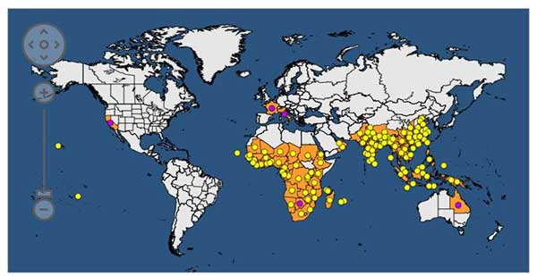 Εικόνα 1: Παγκόσμια διασπορά του επιβλαβούς οργανισμού Bactrocera dorsalis (πηγή: EPPO).