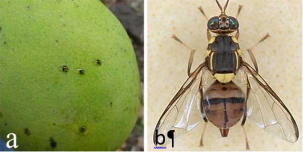 Εικόνα 3: α) Νύγματα ωοτοκίας σε καρπό μάνγκο όπου οι μύγες των φρούτων γεννούν τα αυγά τους. b) θηλυκό Bactrocera dorsalis (Πηγή: IPPC/FAO).