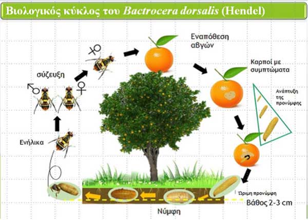 Το Bactrocera dorsalis εναποθέτει τα αβγά του στη σάρκα των καρπών των φυτών ξενιστών του. Η εκκόλαψη των προνυμφών γίνεται 1 με 3 ημέρες μετά την απόθεση των αβγών και ανάλογα με τις συνθήκες, η ανάπτυξή τους διαρκεί από 9 έως 35 ημέρες τρεφόμενες σε βάρος της σάρκας των καρπών των φυτών ξενιστών τους. Η ανάπτυξη του εντόμου επιβραδύνεται σε χαμηλές θερμοκρασίες και σταματά κάτω από τους 13°C. Η νύμφωση γίνεται εντός του εδάφους κάτω από τα φυτά όπου αναπτύχθηκαν οι προνύμφες και τα ενήλικα εμφανίζονται 1 με 2 εβδομάδες αργότερα (Εικόνα 2).