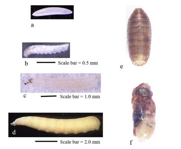 Εικόνα 4: α) αβγό, b) – d) προνυμφικά στάδια και e) – f) νυμφικά στάδια του Bactrocera dorsalis (Πηγή: IPPC/FAO).