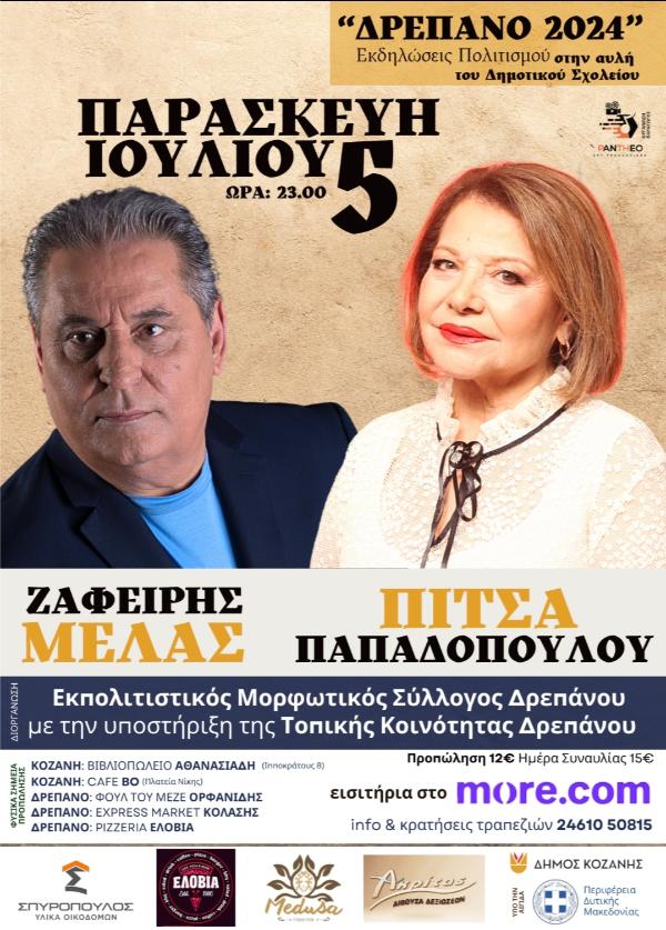 Όλα έτοιμα για τη μεγάλη λαϊκή βραδιά με την Πίτσα Παπαδοπούλου και το Ζαφείρη Μελά, στο Δρέπανο Κοζάνης, την Παρασκευή 5 Ιουλίου 2024, με ώρα έναρξης του καλλιτεχνικού προγράμματος στις 23.00. (οι πόρτες για το κοινό θα ανοίξουν στις 21.30)