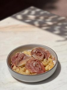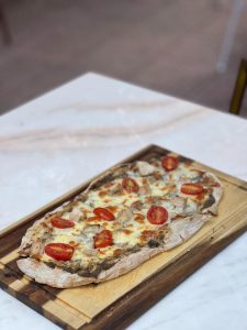 Εκτός από τις κλασικές επιλογές σε pizza, δοκιμάστε τις δύο επιλογές του, σε pinsa με κοτόπουλο, κρέμα καπνιστής μελιτζάνας, mozzarella, ντοµατίνια και pinsa tartufa με κρέμα γάλακτος με λάδι τρούφας, mozzarella, bacon, μανιτάρια, ‘Gnocchi’ με prosciutto, κολοκύθι και μανιτάρια a la crème,ενώ δεν λείπουν από το μενού, οι επιλογές σε δροσερές σαλάτες, ζυμαρικά και κρεατικά.