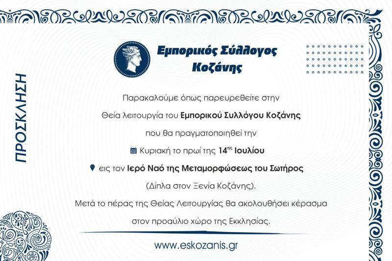 Ο Εμπορικός Σύλλογος Κοζάνης καλεί όλο τον κόσμο στη Θεία Λειτουργία του Συλλόγου……..