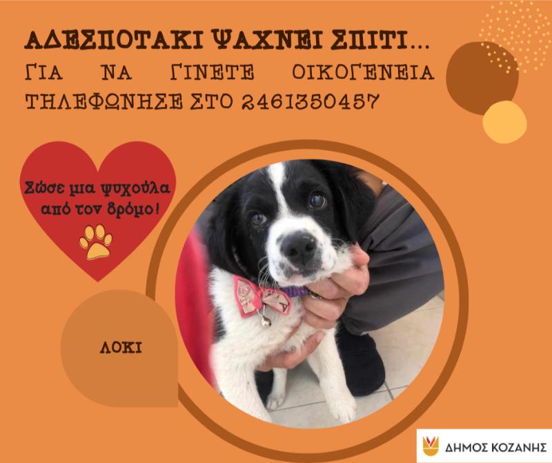 Ο Δήμος Κοζάνης απευθύνει κάλεσμα σε όσες και όσους επιθυμούν να υιοθετήσουν ένα αδέσποτο ζώο συντροφιάς, προκειμένου να του προσφέρουν ένα ζεστό σπιτικό με πολλή αγάπη.