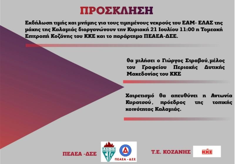 Εκδήλωση τιμής και μνήμης για τους τιμημένους νεκρούς του ΕΑΜ-ΕΛΑΣ της μάχης της Καλαμιάς διοργανώνουν την Κυριακή 21 Ιουλίου στις 11 π.μ., η Τομεακή Επιτροπή Κοζάνης του ΚΚΕ κα το παράρτημα Κοζάνης της ΠΕΑΕΑ-ΔΣΕ .