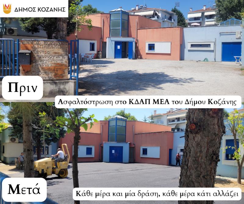 Ικανοποιώντας ένα χρόνιο αίτημα της μαθητικής και εκπαιδευτικής μας κοινότητας, η Διεύθυνση Τεχνικών Υπηρεσιών του Δήμου Κοζάνης, πραγματοποίησε έργα ασφαλτόστρωσης στον προαύλιο χώρο του Κέντρου Δημιουργικής Απασχόλησης Παιδιών με Αναπηρία, που βρίσκεται επί της οδού Αιανής, στην πόλη της Κοζάνης.