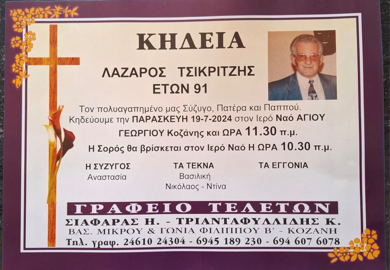 Έφυγε από τη ζωή ο συνταξιούχος και επι χρόνια επιχειρηματίας στον κλάδο της εστίασης, Λάζαρος Τσικριτζής.