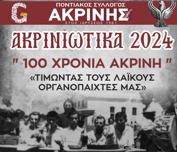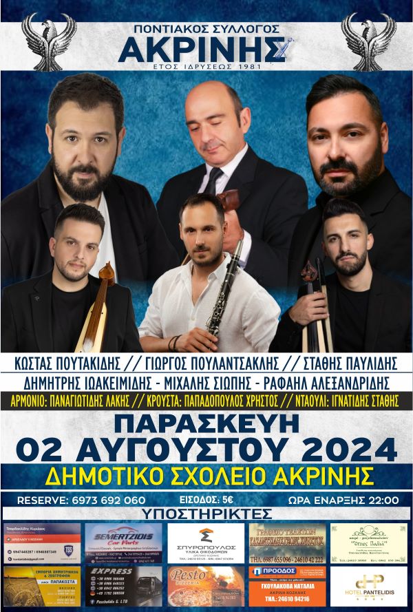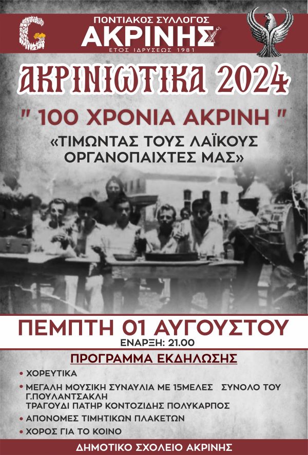 Κοζάνη 21/07/2024 Ποντιακός Σύλλογος Ακρινής Καλοκαιρινές Διήμερες Εκδηλώσεις 2024 0 Ο Ποντιακός Σύλλογος Ακρινής σας προσκαλεί στις διήμερες εκδηλώσεις που διοργανώνει στις 1 και 2 Αυγούστου