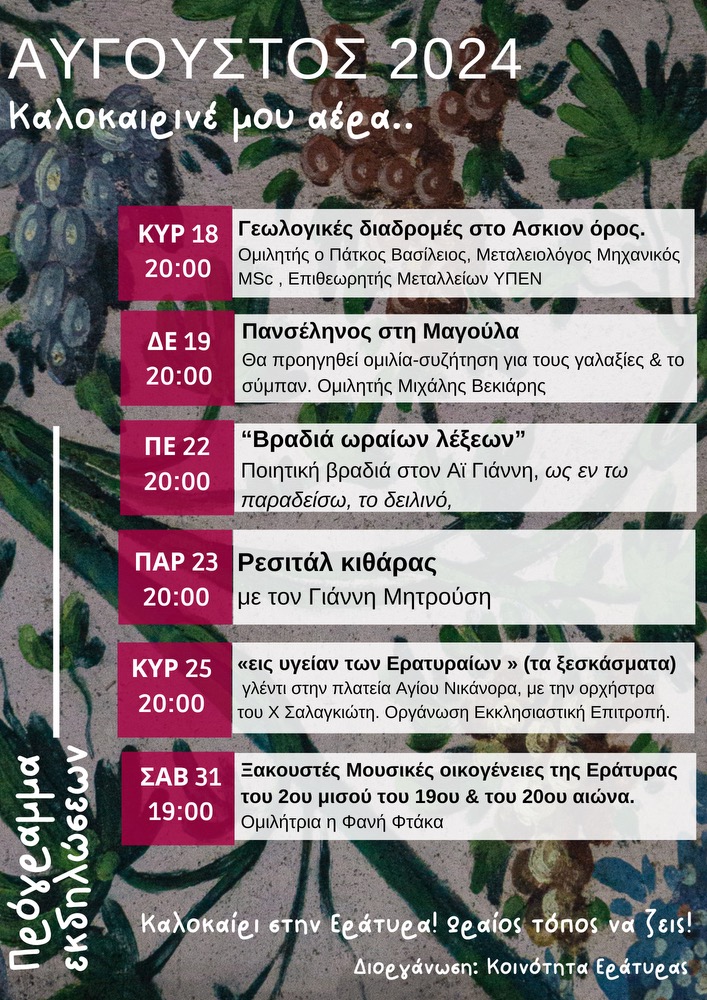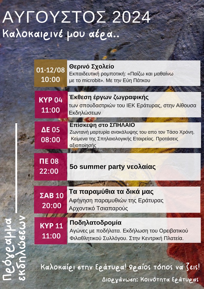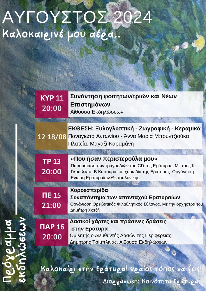 Κοζάνη 24/07/2024 Εράτυρα Κοζάνης: “Καλοκαιρινέ μου άερα”, το πρόγραμμα εκδηλώσεων του Αυγούστου 2024 0 “Καλοκαιρινέ μου άερα”, το πρόγραμμα εκδηλώσεων του Αυγούστου 2024! Σας περιμένουμε!