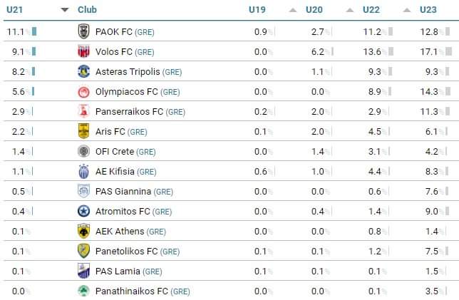 Όπως δείχνουν τα στοιχεία της CIES, οι περισσότερες ομάδες της Super League και των χαμηλότερων κατηγοριών προτιμούν να επενδύουν σε ξένους παίκτες, αγνοώντας τα ταλέντα που αναπτύσσονται στις ακαδημίες τους. Αυτή η προσέγγιση μπορεί να προσφέρει άμεσες λύσεις και αποτελέσματα, αλλά μακροπρόθεσμα υπονομεύει την ανάπτυξη του ποδοσφαίρου στην Ελλάδα, καθώς οι νεαροί παίκτες δεν έχουν την ευκαιρία να αποκτήσουν την απαραίτητη εμπειρία και να εξελιχθούν στο έπακρο των δυνατοτήτων τους. Στη πρώτη φωτογραφία βλέπουμε το ποσοστό των Ελλήνων που αγωνίστηκαν σε κάθε σύλλογο για την περσινή χρονιά. “Πρωταθλητής” στην κατηγορία αυτή είναι ο Ατρόμητος, όπου οι μισοί του ποδοσφαιριστές είναι έλληνες. Απεναντίας, τα αντίστοιχα ποσοστά του “Big 5” είναι αποκαρδιοτικά. Ποσοστό 26% για την δευτεραθλήτρια ΑΕΚ, 22% για τον πρωταθλητή ΠΑΟΚ. Ολυμπιακός και Παναθηναϊκός ακολουθούν με 21% και 19%, ενώ τελευταίος ολόκληρης της λίστας ο Άρης με μόλις 15%!