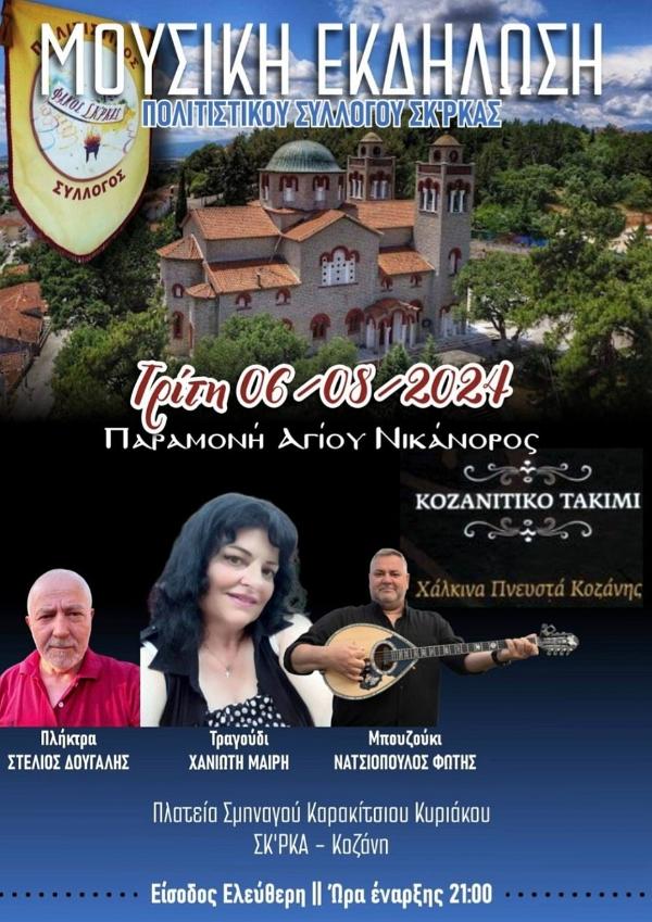 Μουσική εκδήλωση του Π.Σ. “Σκ’ρκας” στις 6 Αυγούστου με το παραδοσιακό συγκρότημα χάλκινων πνευστών “Κοζανίτικο Τακίμι” και λαϊκό πρόγραμμα με τους τραγούδι Μαίρη Χανιώτη, Μπουζουκι και τραγούδι Φώτη Νατσιόπουλο, Πλήκτρα Στέλιο Δουγαλή.