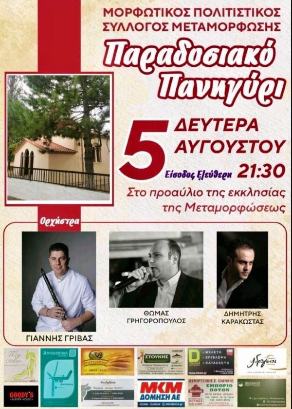 Κοζάνη 05/08/2024 Δευτέρα 5 Αυγούστου: Παραδοσιακό Πανηγύρι με την ορχήστρα του Γιάννη Γρίβα στη Μεταμόρφωση Κοζάνης 0 Παραδοσιακό Πανηγύρι με την ορχήστρα του Γιάννη Γρίβα διοργανώνει ο Πολιτιστικός Μορφωτικός Σύλλογος Μεταμόρφωσης το βράδυ της Δευτέρας 5 Αυγούστου, στο προαύλιο χώρο της εκκλησίας. Ώρα Έναρξης 21:30 Είσοδος Ελεύθερη