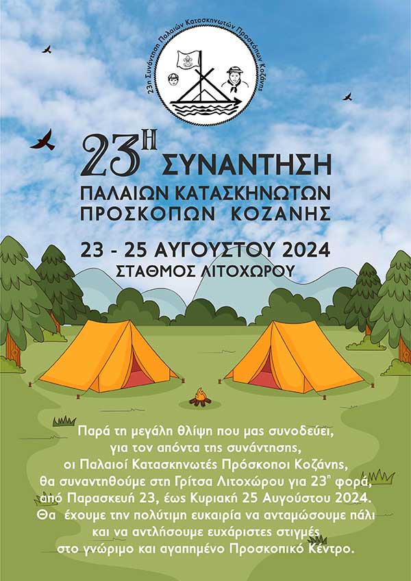 Παρά τη μεγάλη θλίψη που μας συνοδεύει, για τον απόντα της συνάντησης, οι Παλαιοί Κατασκηνωτές Πρόσκοποι Κοζάνης, θα συναντηθούμε στη Γρίτσα Λιτοχώρου για 23η φορά, από Παρασκευή 23, έως Κυριακή 25 Αυγούστου.