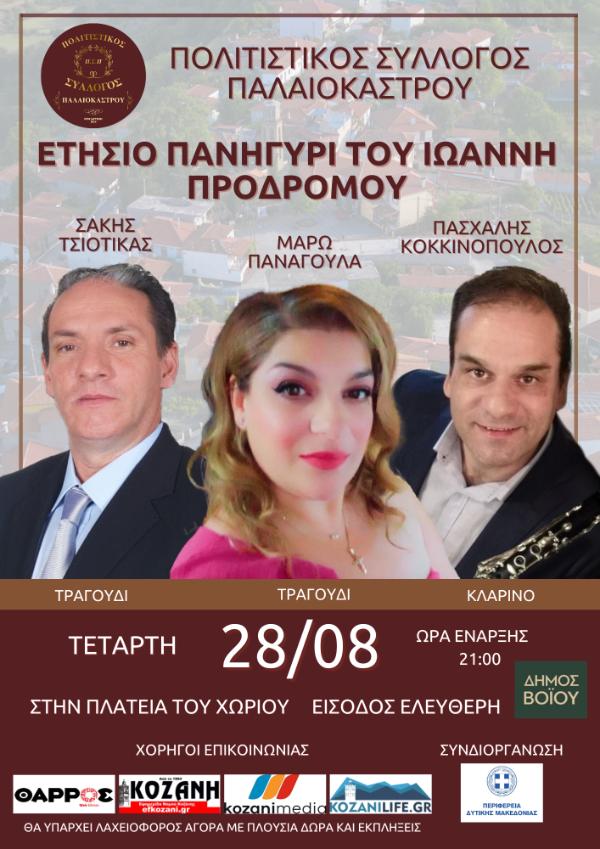 Ο Πολιτιστικός Σύλλογος Παλαιοκάστρου του δήμου Βοίου σας καλεί στο ετήσιο πανηγύρι του Ιωάννη Προδρόμου που θα πραγματοποιηθεί στην πλατεία του χωριού την Τετάρτη 28 Αυγούστου και ώρα 21:00.