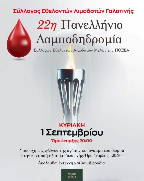 22η Πανελλήνια Λαμπαδηδρομία Συλλόγων Εθελοντών Αιμοδοτών Μελών της ΠΟΣΕΑ στην Γαλατινή την Κυριακή 1 Σεπτεμβρίου.
