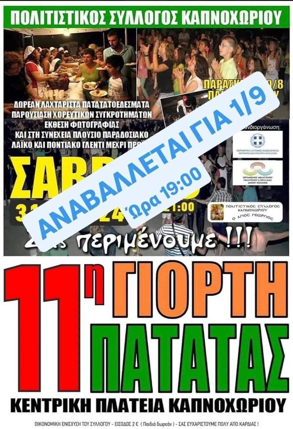 Κοζάνη 01/09/2024 Αναβάλλεται για 1 Σεπτεμβρίου η Γιορτή Πατάτας στο Καπνοχώρι Κοζάνης 0 Αναβάλλεται για 1 Σεπτεμβρίου η Γιορτή Πατάτας στο Καπνοχώρι Κοζάνης.