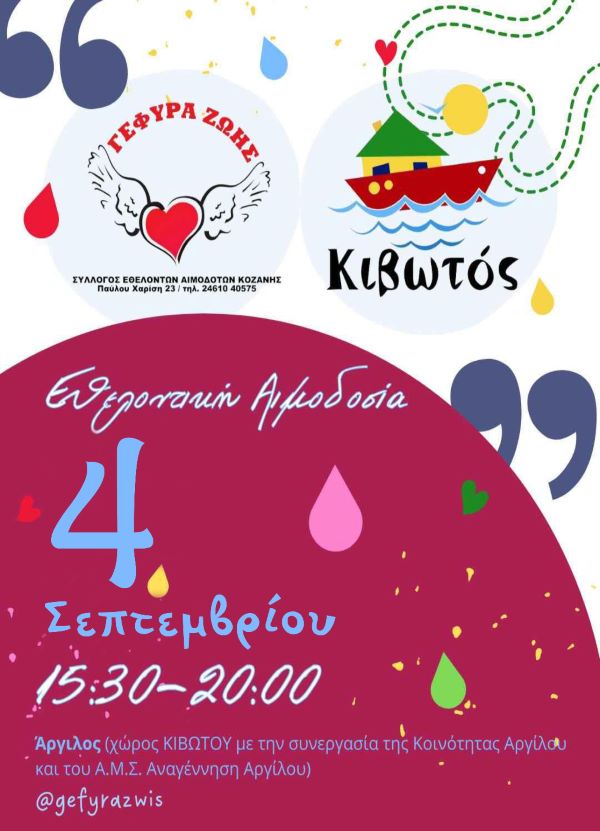 Η 25η Αιμοδοσία γίνεται την Τετάρτη 4 Σεπτεμβρίου 2024 από τις 15:30 – 20:00 στον Άργιλο, στο χώρο της ΚΙΒΩΤΟΥ Παιδιατρικό Κέντρο Αποθεραπείας-Αποκατάστασης, Διημέρευσης Ημερήσιας Φροντίδας Α.με Α με την συνεργασία της Κοινότητας Αργίλου, τον Α.Μ.Σ. Αναγέννηση Αργίλου και την Αιμοδοσία του Γ.Ν. Κοζάνης.