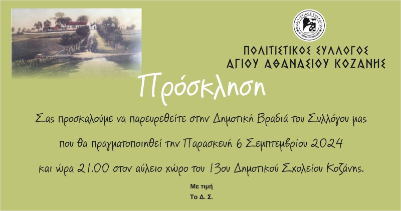 Ο Σύλλογός μας διοργανώνει ΠΑΡΑΔΟΣΙΑΚΗ ΔΗΜΟΤΙΚΗ ΒΡΑΔΙΑ στον αύλειο χώρο του 13ου Δημοτικού Σχολείου, περιοχή Αγίου Αθανασίου. Σας Καλούμε όλους την Παρασκευή 6 Σεπτεμβρίου στις 9μ.μ να συμμετέχετε ενεργά και να διασκεδάσουμε όλοι μαζί.