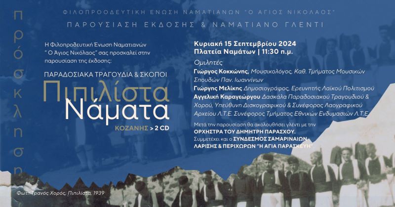 Η Φιλοπροοδευτική Ένωση Ναματιανών “Ο Άγιος Νικόλαος” σας προσκαλεί στην παρουσίαση της έκδοσης με τίτλο: “Πιπιλίστα – Νάματα Κοζάνης: Παραδοσιακά Τραγούδια & Σκοποί” την Κυριακή, 15 Σεπτεμβρίου 2024 στις 11:30 π.μ. στην πλατεία Ναμάτων.