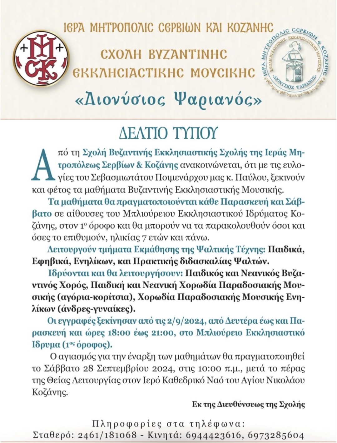 Κοζάνη 10/09/2024 Έναρξη μαθημάτων Σχολής Βυζαντινής Εκκλησιαστικής Μουσικής Ι.Μ.Σ.Κ. 0 Έναρξη μαθημάτων Σχολής Βυζαντινής Εκκλησιαστικής Μουσικής Ι.Μ.Σ.Κ.