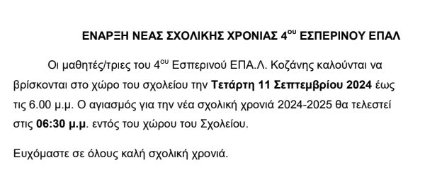 Οι μαθητές/τριες του 4ου Εσπερινού ΕΠΑΛ.Λ. καλούνται να βρίσκονται στο χώρο του Σχολείου την Τετάρτη 11 Σεπτεμβρίου 2024 έως τις 6:00 μ.μ..