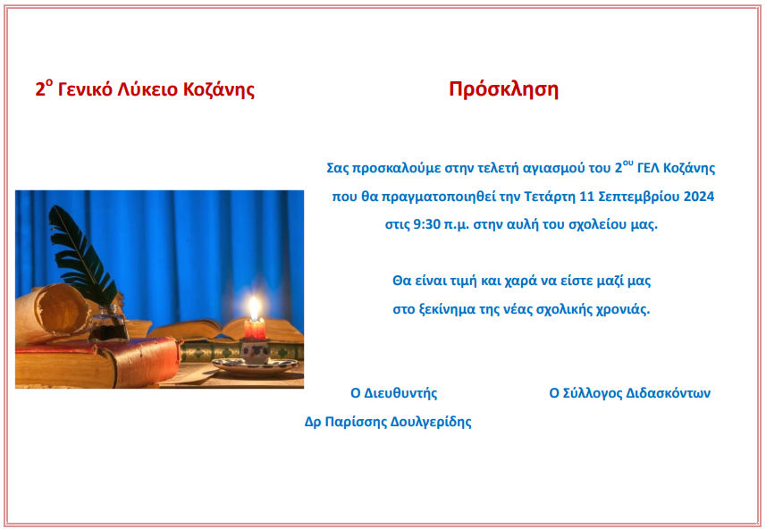 Ενημερώνουμε τους μαθητές και τις μαθήτριες του Εσπερινού Γυμνασίου και Εσπερινού Γενικού Λυκείου Κοζάνης, ότι η ακολουθία του αγιασμού για την έναρξη του νέου σχολικού έτους 2024 – 2025 θα πραγματοποιηθεί τη Τετάρτη 11 Σεπτεμβρίου 2024 και ώρα 17:30 μ.μ. στο χώρο του σχολείου μας, Ανδρέα Κάλβου 1 στην Κοζάνη.