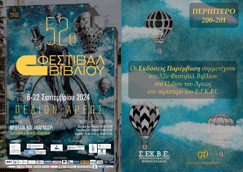 Οι Εκδόσεις Παρέμβαση συμμετέχουν στο 52ο Φεστιβάλ Βιβλίου, που πραγματοποιείται στο Πεδίον του Άρεως από τις 6 μέχρι τις 22 Σεπτεμβρίου. Συγκεκριμένα, στο Περίπτερο 200-201 του Συνδέσμου Εκδοτών Βόρειας Ελλάδας οι ενδιαφερόμενοι μπορούν να βρουν τα βιβλία των Εκδόσεων Παρέμβαση. Οι ημέρες και οι ώρες λειτουργίας του Φεστιβάλ είναι: Δευτέρα έως Πέμπτη 18:00-22:30, Παρασκευή & Σάββατο 18:00-23:00 και Κυριακή 10:30-15:00 & 18:00-22:30. Το περίπτερο επισκέφθηκαν μέχρι στιγμής συγγραφείς των Εκδόσεων, φίλοι και συνεργάτες.