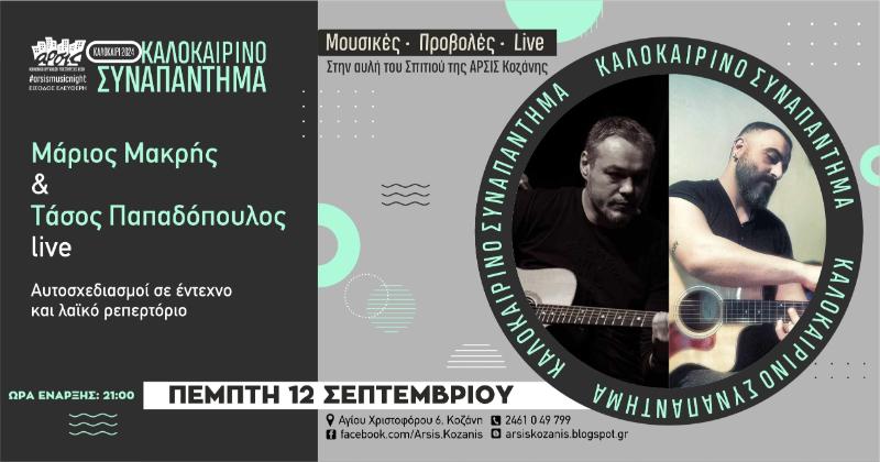 Ο Τάσος και ο Μάριος μοιράζονται, την Πέμπτη 12 Σεπτεμβρίου, στις 21:00, στην αυλή του σπιτιού της ΑΡΣΙΣ Κοζάνης, την κοινή τους αγάπη για τη μουσική και τον αυτοσχεδιασμό σε ένα έντεχνο και λαϊκό ρεπερτόριο, για να τραγουδήσουμε παρέα.