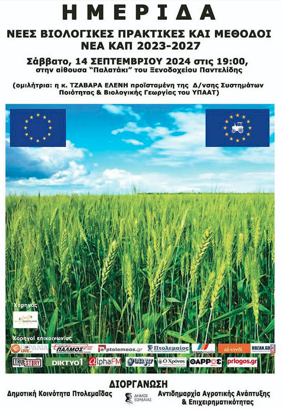 Σας προσκαλούμε το Σάββατο 14/9 και ώρα 19:00, στην ημερίδα με θέμα “νέες βιολογικές πρακτικές” που αφορά αγρότες, κτηνοτρόφους και μελισσοκόμους και θα πραγματοποιηθεί στο ξενοδοχείο Παντελίδης στην αίθουσα “Παλατάκι”.