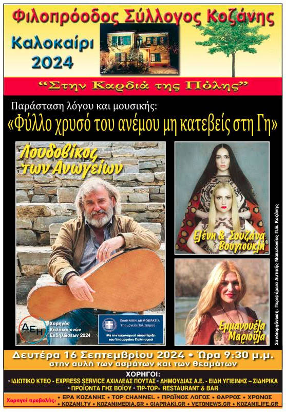 Ο Φιλοπρόοδος Σύλλογος Κοζάνης ρίχνει αυλαία στις, ομολογουμένως επιτυχημένες, μουσικές εκδηλώσεις του φετινού καλοκαιριού και σας προσκαλεί σε μια παράσταση λόγου και μουσικής που έχει εμπνευστεί και παρουσιάζει ο πάντα ευρηματικός και γνήσιος εκφραστής της Κρητικής παράδοσης, Λουδοβίκος των Ανωγείων, πολλών χρόνων καλός μας φίλος.