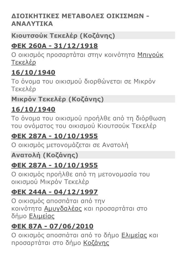 Κοινοτικά: Ο οικισμός Κιουτσούκ Τεκελέρ στις 31/12/1918 προσαρτάται στην κοινότητα Μπιγούκ Τεκελέρ. Στις 16/10/1940 το όνομα του οικισμού διορθώνεται σε Μικρόν Τεκελέρ και στις 10/10/1955 μετονομάζεται σε Ανατολή. Στις 4/12/1997 προσαρτάται στο Δήμο Ελίμειας και στις 7/6/2010 στο δήμο Κοζάνης.