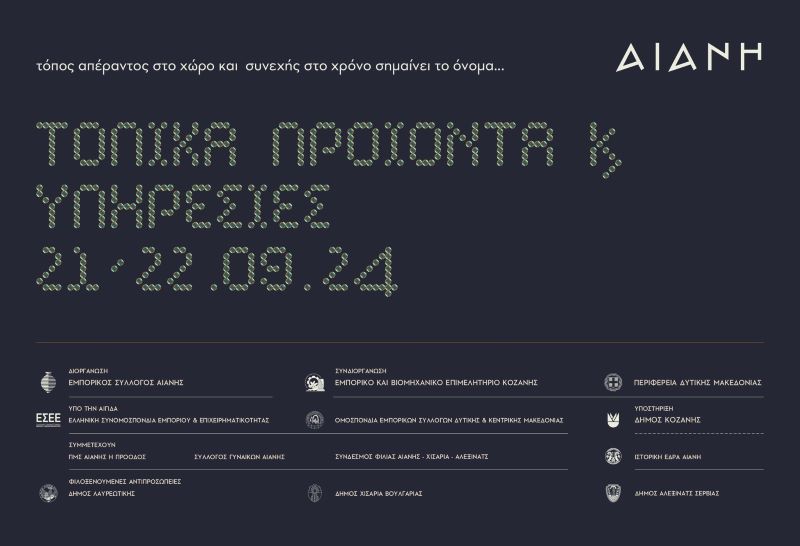 Ο Εμπορικός Σύλλογος Αιανής σε συνεργασία με το Επιμελητήριο Κοζάνης στο πλαίσιο της ανάδειξης και προώθησης των τοπικών προϊόντων της ευρύτερης περιοχής διοργανώνουν την Έκθεση Τοπικά Προϊόντα και Υπηρεσίες που θα πραγματοποιηθεί στις 21 & 22 Σεπτεμβρίου στην Αιανή, την ιστορική πόλη της Δυτικής Μακεδονίας και Ιστορική Έδρα του Δήμου Κοζάνης.