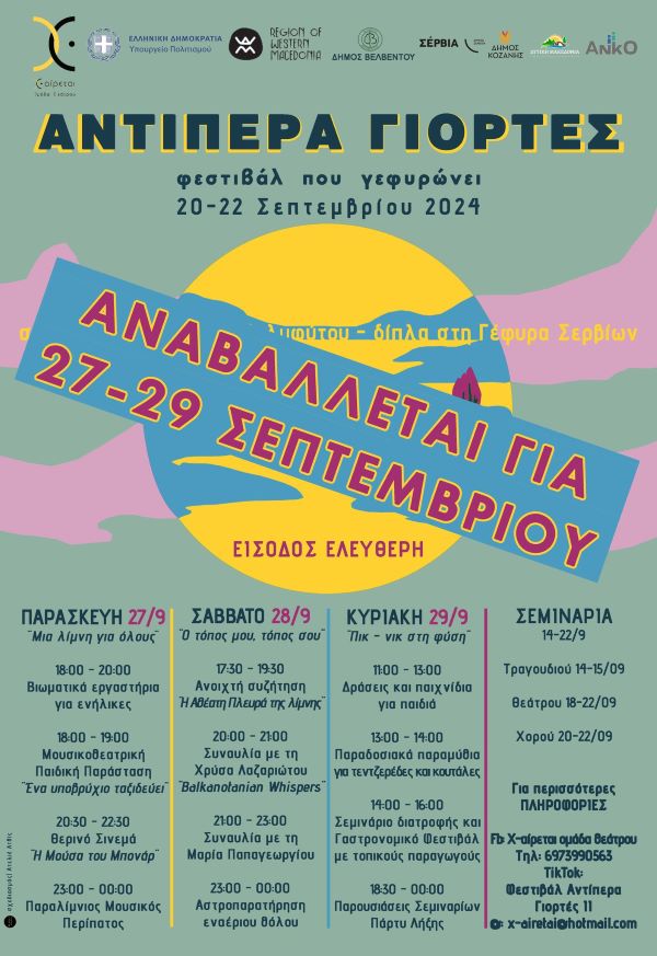 Λόγω καιρικών συνθηκών το πρόγραμμα των δράσεων του Πολυθεματικού Φεστιβάλ Αντίπερα Γιορτές αναβάλλεται.