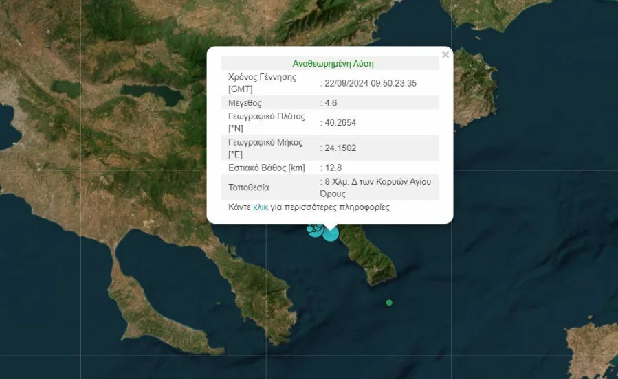 Το Γεωδυναμικό Ινστιτούτο κάνει λόγο για δόνηση με επίκεντρο που εντοπίζεται 8 χλμ. δυτικά των Καρυών Αγίου Όρους και εστιακός βάθος 12,8 χιλιόμετρα.