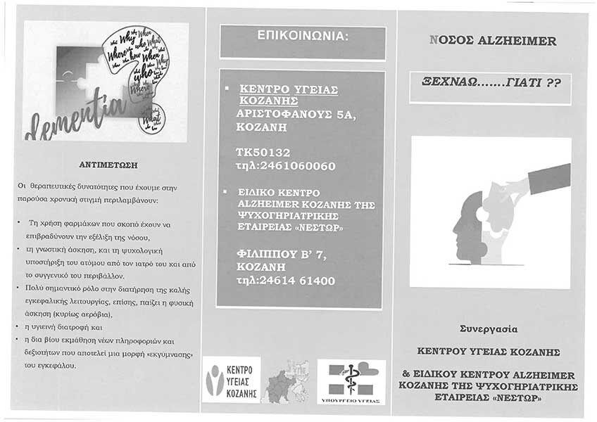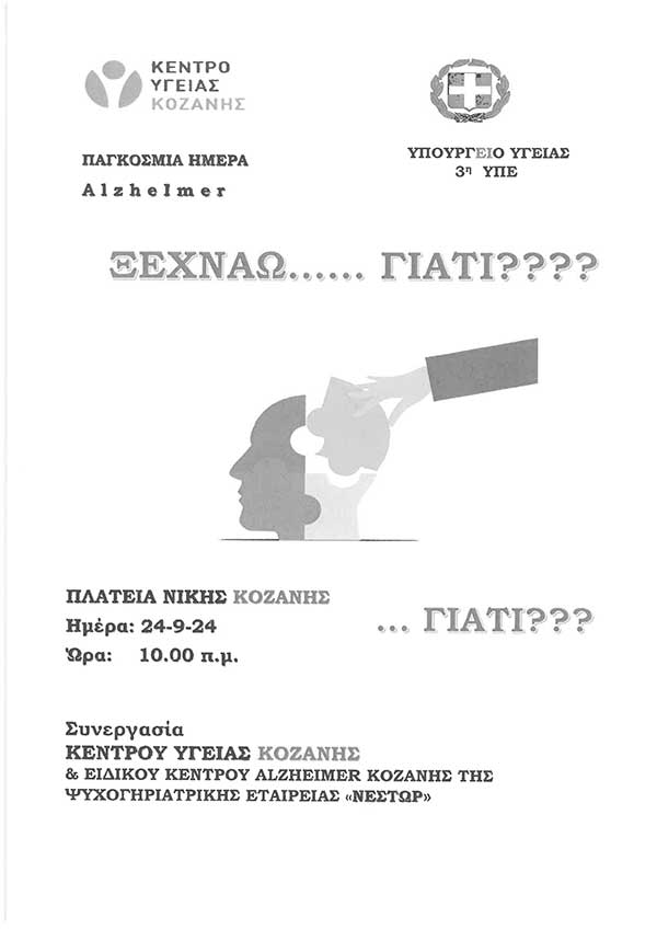 Κοζάνη 23/09/2024 Δράση ενημέρωσης του Κ.Υ. Κοζάνης με θέμα την παγκόσμια ημέρα της νόσου Alzheimer στην κεντρική πλατεία 0 Το Κέντρο Υγείας Κοζάνης με θέμα την Παγκόσμια Ημέρα της νόσου, θα πραγματοποιήσει δράση ενημέρωσης το πρωί της Τρίτης 24 Σεπτεμβρίου, στην κεντρική πλατεία Κοζάνης.