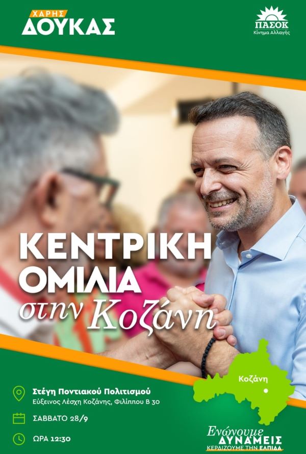 Την πόλη της Κοζάνης θα επισκεφτεί ο Υποψήφιος Πρόεδρος του ΠΑΣΟΚ – Κινήματος Αλλαγής Χάρης Δούκας το Σάββατο, 28-09 στις 12:30. Η ομιλία θα πραγματοποιηθεί στη Στέγη Ποντιακού Πολιτισμού, Φιλίππου Β 30.