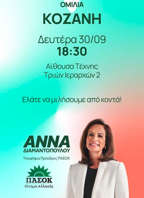 Η Υπ. Πρόεδρος του ΠΑΣΟΚ Άννα Διαμαντοπούλου θα πραγματοποιήσει κεντρική ομιλία σε πολιτικούς φίλους στην Κοζάνη την Δευτέρα 30/9 στις 18:30 στην Αίθουσα Τέχνης (Τριών Ιεραρχών 2).
