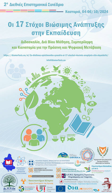 Ο Οργανισμός Καινοτομίας για τη Βιώσιμη Ανάπτυξη «Διαμόρφωσις» σε συνεργασία με το Διατμηματικό Πρόγραμμα Μεταπτυχιακών Σπουδών (Δ.Π.Μ.Σ.) «Επιστήμες του Περιβάλλοντος και Εκπαίδευση για την Αειφορία» του Πανεπιστημίου Ιωαννίνων, το Μεταπτυχιακό Πρόγραμμα «Μάθηση στις Φυσικές Επιστήμες και το Περιβάλλον – Κατεύθυνση Περιβαλλοντική Εκπαίδευση και Εκπαίδευση για την Αειφορία» του Τμήματος Επιστημών της Αγωγής του Πανεπιστημίου Κύπρου, το Δ.Π.Μ.Σ. «Εκπαίδευση για την Αειφορία και το Περιβάλλον» του Πανεπιστημίου Θεσσαλίας, το Δ.Π.Μ.Σ. «Προηγμένες Τεχνολογίες Πληροφορικής και Υπηρεσίες» του Πανεπιστημίου Δυτικής Μακεδονίας, το Ξενόγλωσσο Πρόγραμμα Σπουδών “Economics and Sustainable Development” του Πανεπιστημίου Δυτικής Μακεδονίας, το Π.Μ.Σ. «Διαχείριση Περιβάλλοντος και Περιβαλλοντική Εκπαίδευση» του Διεθνούς Πανεπιστημίου της Ελλάδος, το Παιδαγωγικό Τμήμα Ειδικής Αγωγής του Πανεπιστημίου Θεσσαλίας, το Τμήμα Πληροφορικής του Πανεπιστημίου Δυτικής Μακεδονίας, την Περιφερειακή Διεύθυνση Πρωτοβάθμιας και Δευτεροβάθμιας Εκπαίδευσης Δυτικής Μακεδονίας, την Περιφερειακή Διεύθυνση Πρωτοβάθμιας και Δευτεροβάθμιας Εκπαίδευσης Ηπείρου, την Περιφερειακή Διεύθυνση Πρωτοβάθμιας και Δευτεροβάθμιας Εκπαίδευσης Στερεάς Ελλάδας, το Κέντρο Εκπαίδευσης για το Περιβάλλον και την Αειφορία (Κ.Ε.ΠΕ.Α./Κ.Π.Ε.) Καστοριάς και τον Δήμο Καστοριάς, οργανώνουν το 2ο Διεθνές Επιστημονικό Συνέδριο «Οι 17 Στόχοι Βιώσιμης Ανάπτυξης στην Εκπαίδευση – Διδασκαλία, Διά Βίου Μάθηση, Συμπερίληψη και Καινοτομία για την Πράσινη και Ψηφιακή Μετάβαση» στην Καστοριά από 04 έως και 06 Οκτωβρίου 2024. Το Συνέδριο συγχρηματοδοτείται από το Πρόγραμμα “It’s Global Education Time (GET). From School Curricula to Youth Actions for Sustainable Development”.