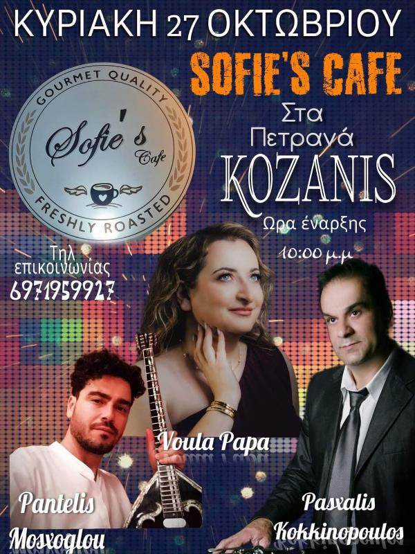 Μια όμορφη λαϊκοδημοτική βραδιά με την Βούλα Παπά, τον Παντελή Μόσχογλου και τον Πασχάλη Κοκκινόπουλο διοργανώνει το Sofie’s Cafe στα Πετρανά Κοζάνης, την Κυριακή 27 Οκτωβρίου.