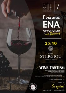 Την Παρασκευή στις 26 Οκτωβρίου, όπως και κάθε Παρασκευή, το Sette wine bar restaurant , σας δίνει τη δυνατότητα να ανακαλύψετε νέες γευστικές εμπειρίες από εκλεκτές ετικέτες κρασιών. Αυτή τη φορά από το κτήμα Στεργίου! Μην χάσετε την ευκαιρία για ένα μοναδικό ταξίδι στον θαυμαστό κόσμο του κρασιού προς τέρψιν του ουρανίσκου σας!
