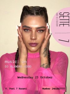 Η διασκέδαση ξεκινά από το βράδυ της Τετάρτης 23 Οκτωβρίου με τις μουσικές μίξεις της dj Alexadra Good. Την Πέμπτη αναλαμβάνει με τις μουσικές του επιλογές να ντύσει τη βραδιά ,ο dj J.RAS, ενώ την Παρασκευή και το Σάββατο θα απολαύστε πίσω από τα decks τον dj Μπάμπη Αντωνιάδη!