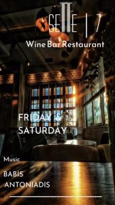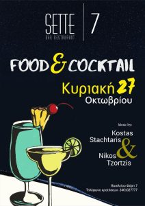 Την Κυριακή 27 Οκτωβρίου ζήστε την πιο in βραδιά, ανεβάζοντας την αίσθηση της απόλαυσης από την food & cocktails list του Sette wine bar restaurant, ενώ την ατμόσφαιρα θα ντύσουν με τις εξαιρετικές μουσικές τους, ο Kostas Stachtaris και ο Nikos Tzortzis.