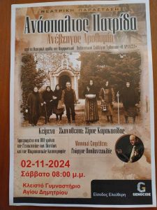 25-10-2024, Παρασκευή 08:00 μ.μ. στην Αίθουσα του Ποντιακού Μορφωτικού Συλλόγου Αγίου Δημητρίου – Ρυακιού. Εκδήλωση μνήμης :