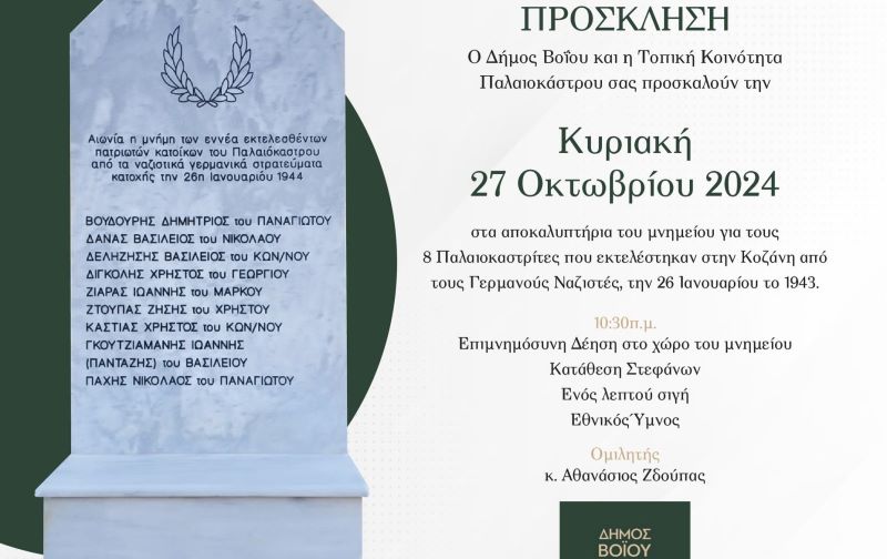 Ο Δήμος Βοΐου και η Τοπική Κοινότητα Παλαιοκάστρου σας προσκαλούν την Κυριακή 27 Οκτωβρίου 2024 στα αποκαλυπτήρια του μνημείου για τους 8 Παλαιοκαστρίτες που εκτελέστηκαν στην Κοζάνη από τους Γερμανούς Ναζιστές, την 26 Ιανουαρίου το 1943.