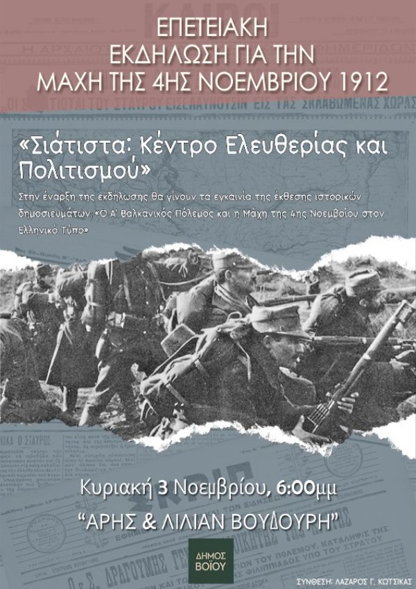Μουσικό Σχολείο Σιάτιστας “Κωνσταντίνος και Ελένη Παπανικολάου” σας καλεί στην επετειακή εκδήλωση για τη μάχη της Σιάτιστας που διοργανώνει ο Δήμος Βοΐου την Κυριακή 3-11-2024 ώρα 18.00 στο Βουδούρειο Πολιτιστικό Κέντρο Σιάτιστας.