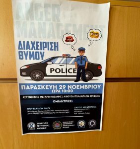 Με πρωτοβουλία της Διεύθυνσης Αστυνομίας Κοζάνης και σε συνεργασία με τις ενώσεις Αξιωματικών Ελληνικής Αστυνομίας Δυτικής Μακεδονίας, Αστυνομικών Υπαλλήλων Κοζάνης και την Τοπική Διοίκηση Κοζάνης της Διεθνούς Ένωσης Αστυνομικών (Ι.Ρ.Α.), πραγματοποιήθηκε σήμερα 29 Νοεμβρίου 2024 το πρωί, στην αίθουσα πολλαπλών χρήσεων του Αστυνομικού Μεγάρου Κοζάνης, ημερίδα με θέμα τη «Διαχείριση Θυμού», απευθυνόμενη σε αστυνομικούς και πυροσβέστες.