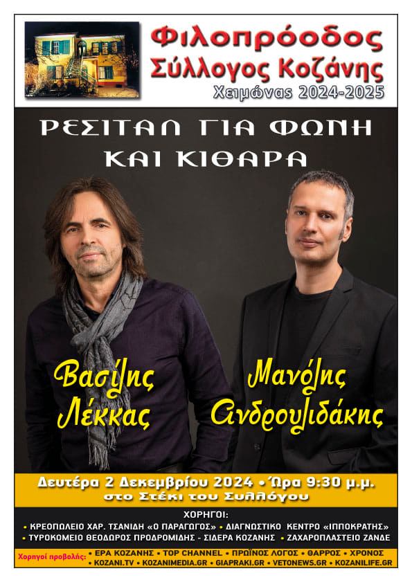 Ο Φιλοπρόοδος Σύλλογος Κοζάνης αποχαιρετά τη φετινή μουσική μας χρονιά με τον Βασίλη Λέκκα και τον Μανόλη Ανδρουλιδάκη να ξανασμίγουν