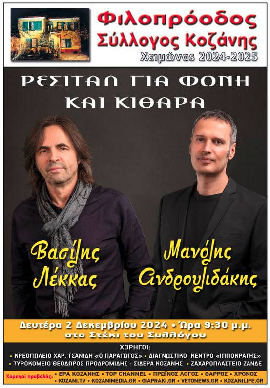 Ο Φιλοπρόοδος Σύλλογος Κοζάνης αποχαιρετά τη φετινή μουσική μας χρονιά με τον Βασίλη Λέκκα και τον Μανόλη Ανδρουλιδάκη να ξανασμίγουν στο φιλόξενο αρχοντικό μας, σε ένα ανεπανάληπτο ρεσιτάλ για φωνή και κιθάρα, πολύτιμο γιορτινό δώρο, χαρισμένο σ’ όλες τις φίλες και τους φίλους του Συλλόγου.