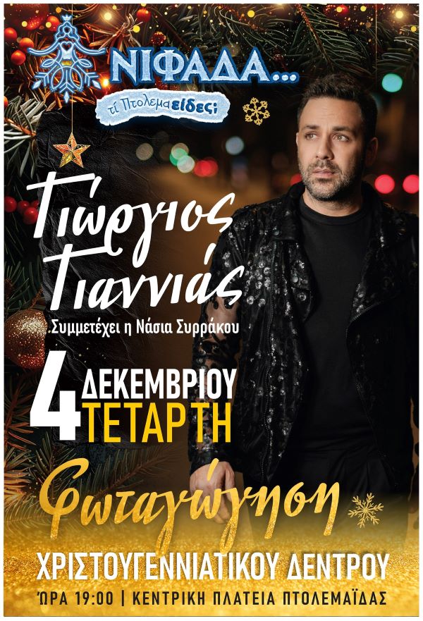 Πτολεμαΐδα 03/12/2024 Με τον Γιώργο Γιαννιά και τη συμμετοχή της Νάσιας Συρράκου η φωταγώγηση του Χριστουγεννιάτικου δέντρου στην Πτολεμαΐδα 0 Με τον Γιώργο Γιαννιά και τη συμμετοχή της Νάσιας Συρράκου θα πραγματοποιηθεί η φωταγώγηση του Χριστουγεννιάτικου δέντρου την Τετάρτη 4 Δεκεμβρίου στην κεντρική πλατεία της Πτολεμαΐδας.