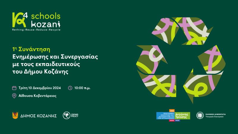 Την Τρίτη 10 Δεκεμβρίου 2024 και ώρα 10:00π.μ. στην αίθουσα ¨Κοβεντάρειος¨ σας προσκαλούμε στην πρώτη συνάντηση ενημέρωσης για την δράση R4Schools του Δήμου Κοζάνης στις σχολικές μονάδες.